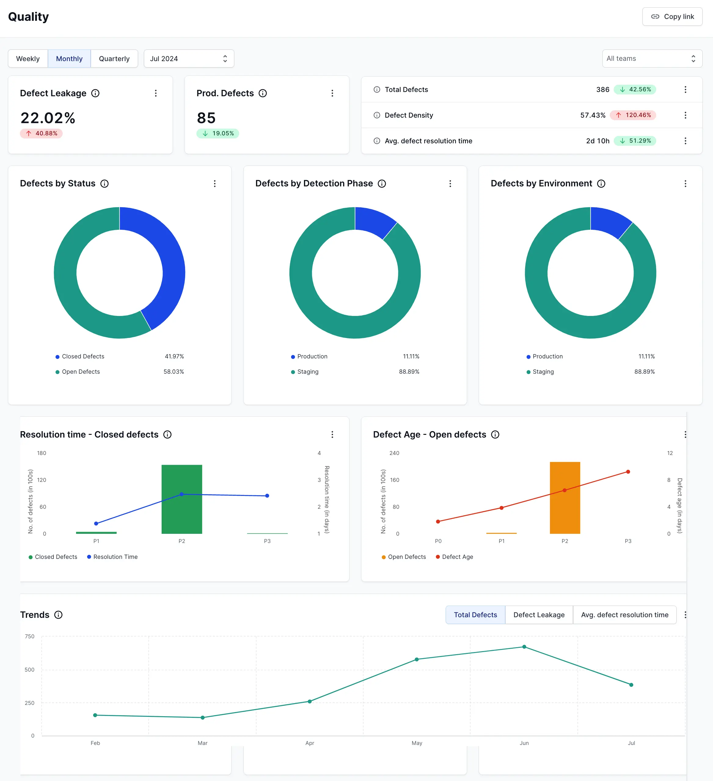 This dashboard shows defect distribution to access your app’s quality. Key Metrics include Defect Leakage and Defect Density. It also tracks defects by their status, detection phase (staging or deployment), and environment. Additionally, you can also view resolution times for closed defects and the age of open defects. Learn more about Quality Metrics here.