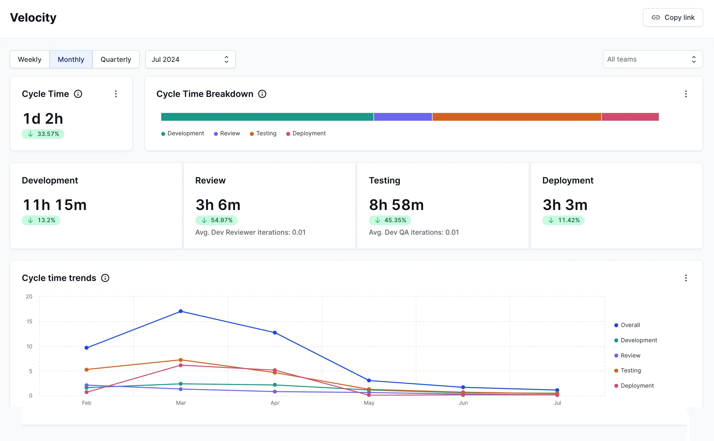 This dashboard tracks how fast tasks go from start to finish through Cycle Time. It is crucial for understanding your delivery speed and improving efficiency. By tracking Cycle Time, you can find and fix delays in the development process. This ensures you met customer needs faster and more effectively. Learn more about Velocity Metrics here.
