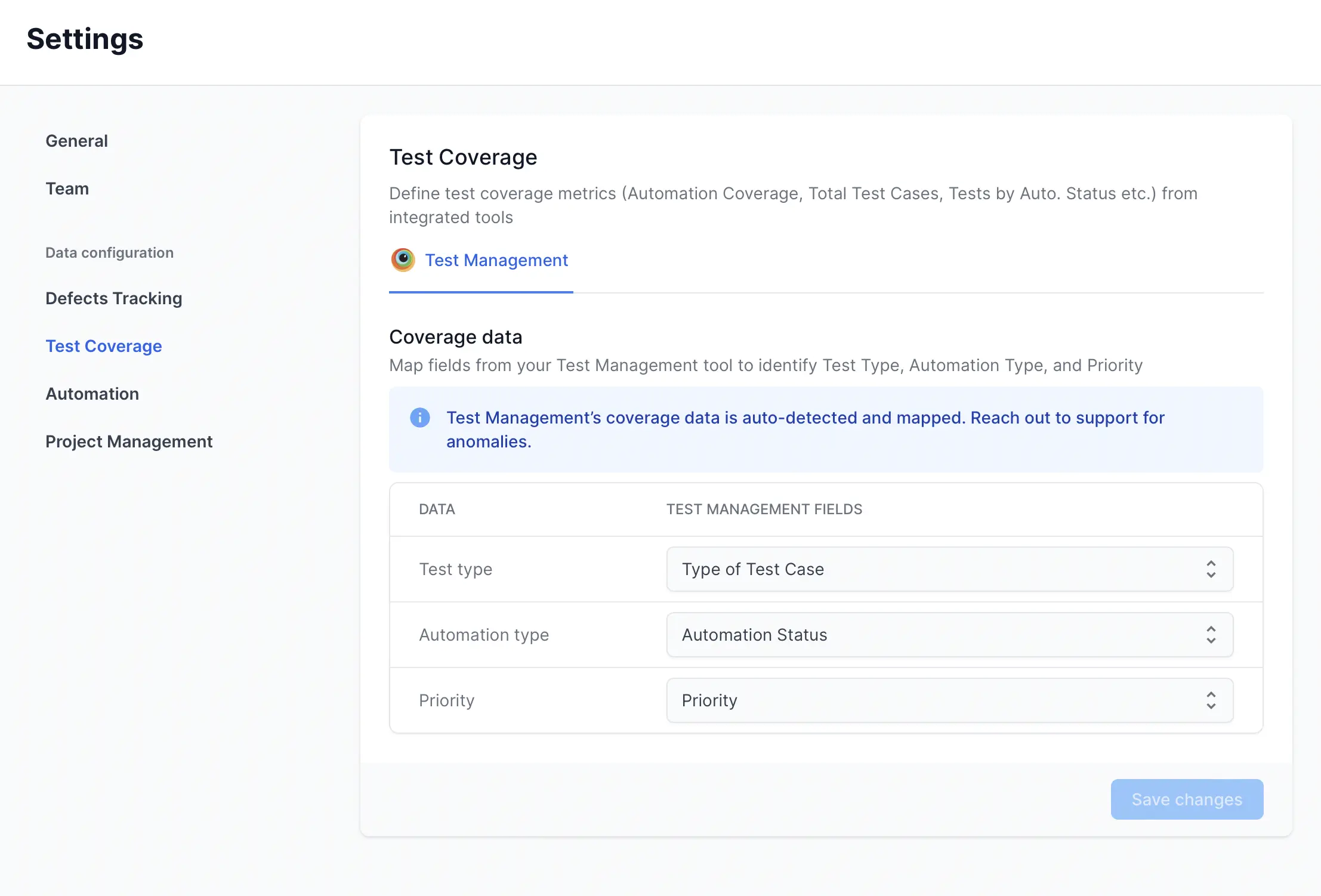 Use the Test Coverage tab in Settings to configure different mapping fields like Priority as per your Test Management setup.