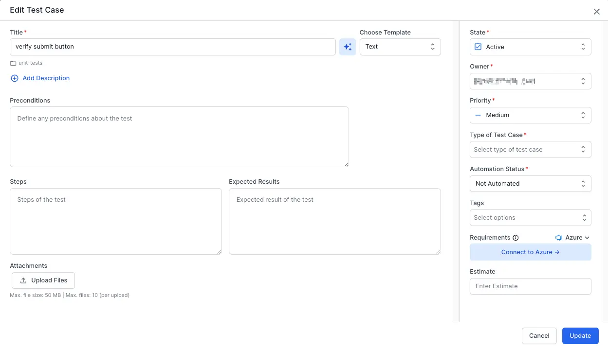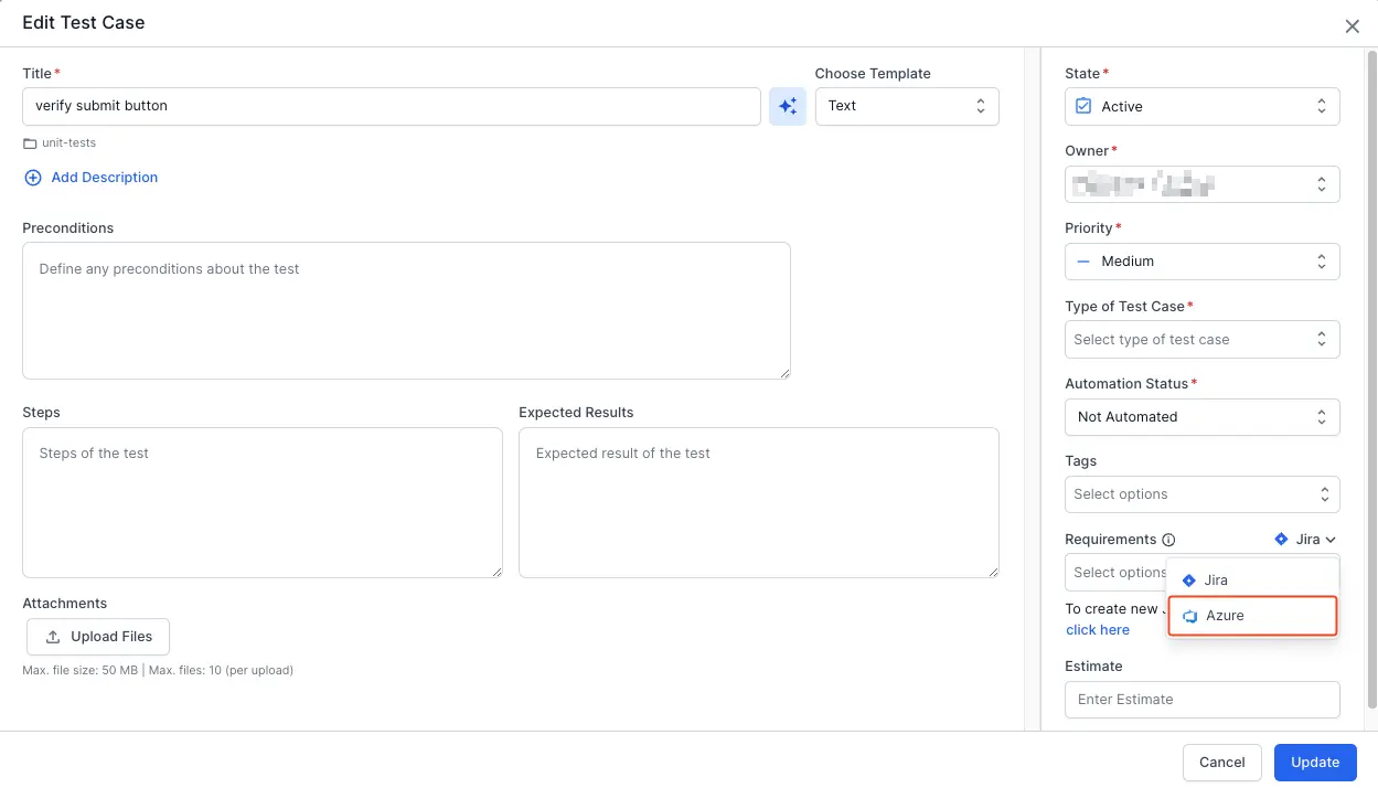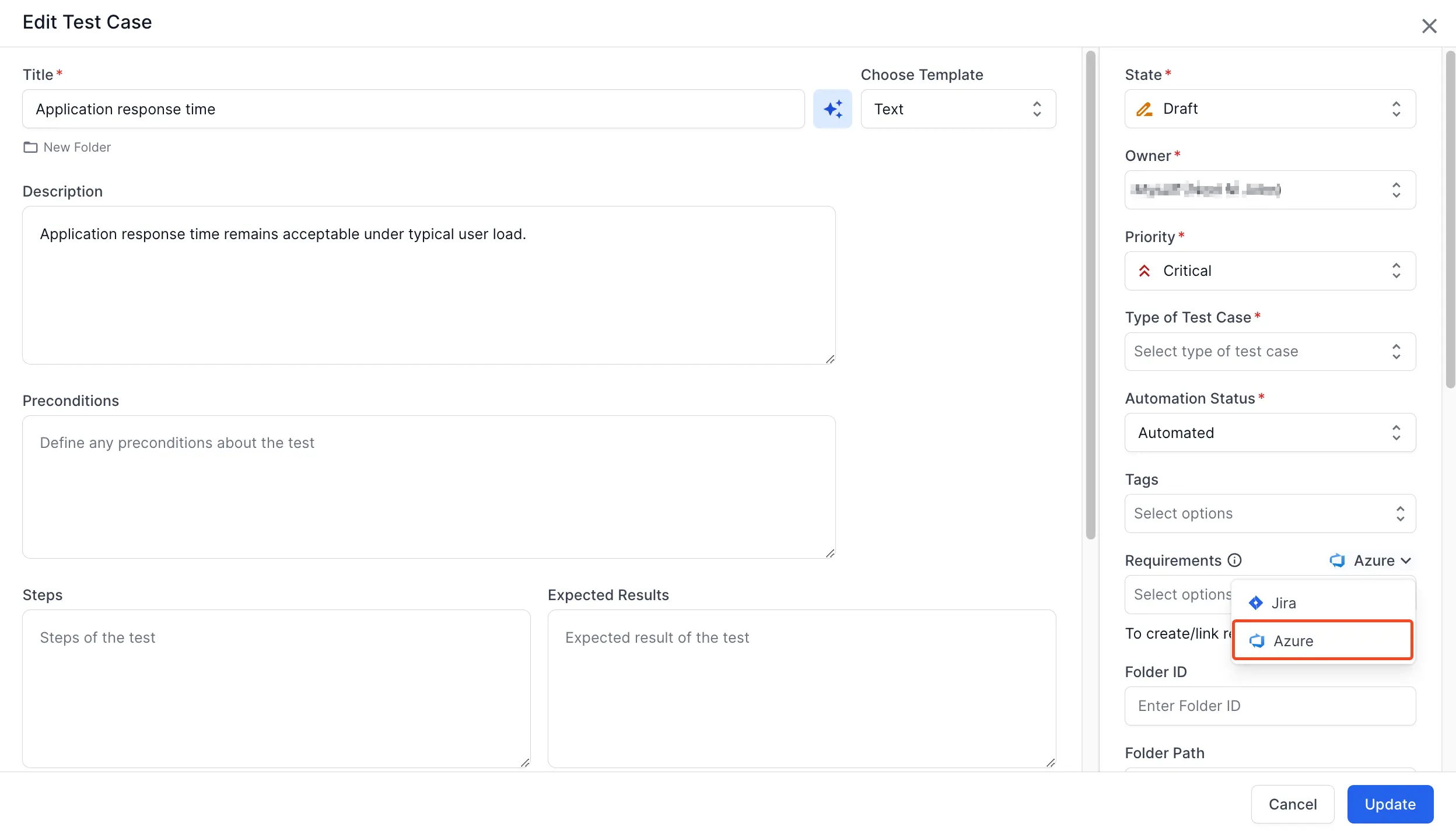 You can add your Azure work items while creating a new test case or editing an existing one. It allows you to directly associate relevant Azure DevOps work items within the test case form.