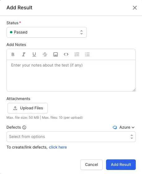 - Navigate to the Add Result window in a test run and select Azure in the defects field.