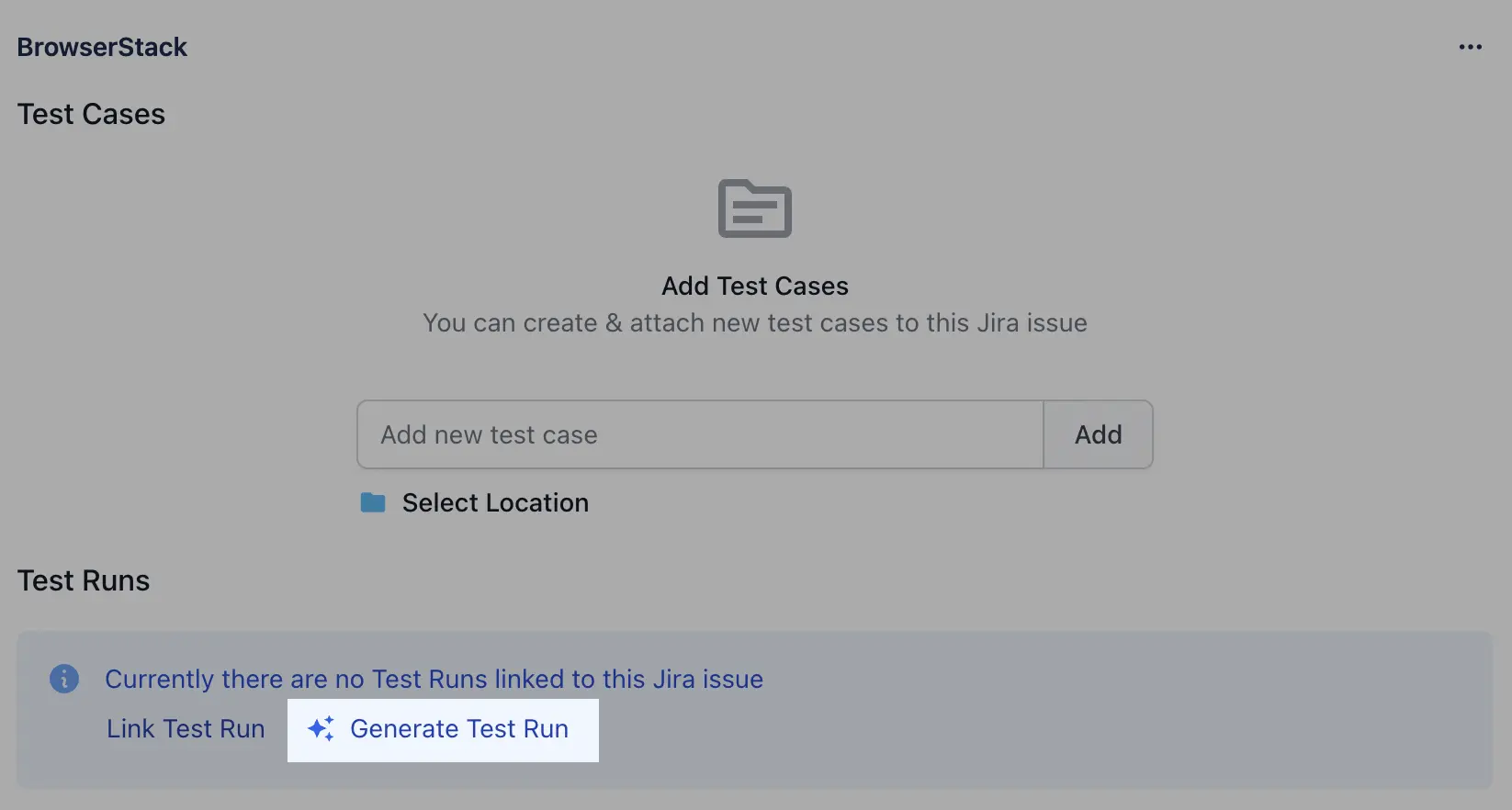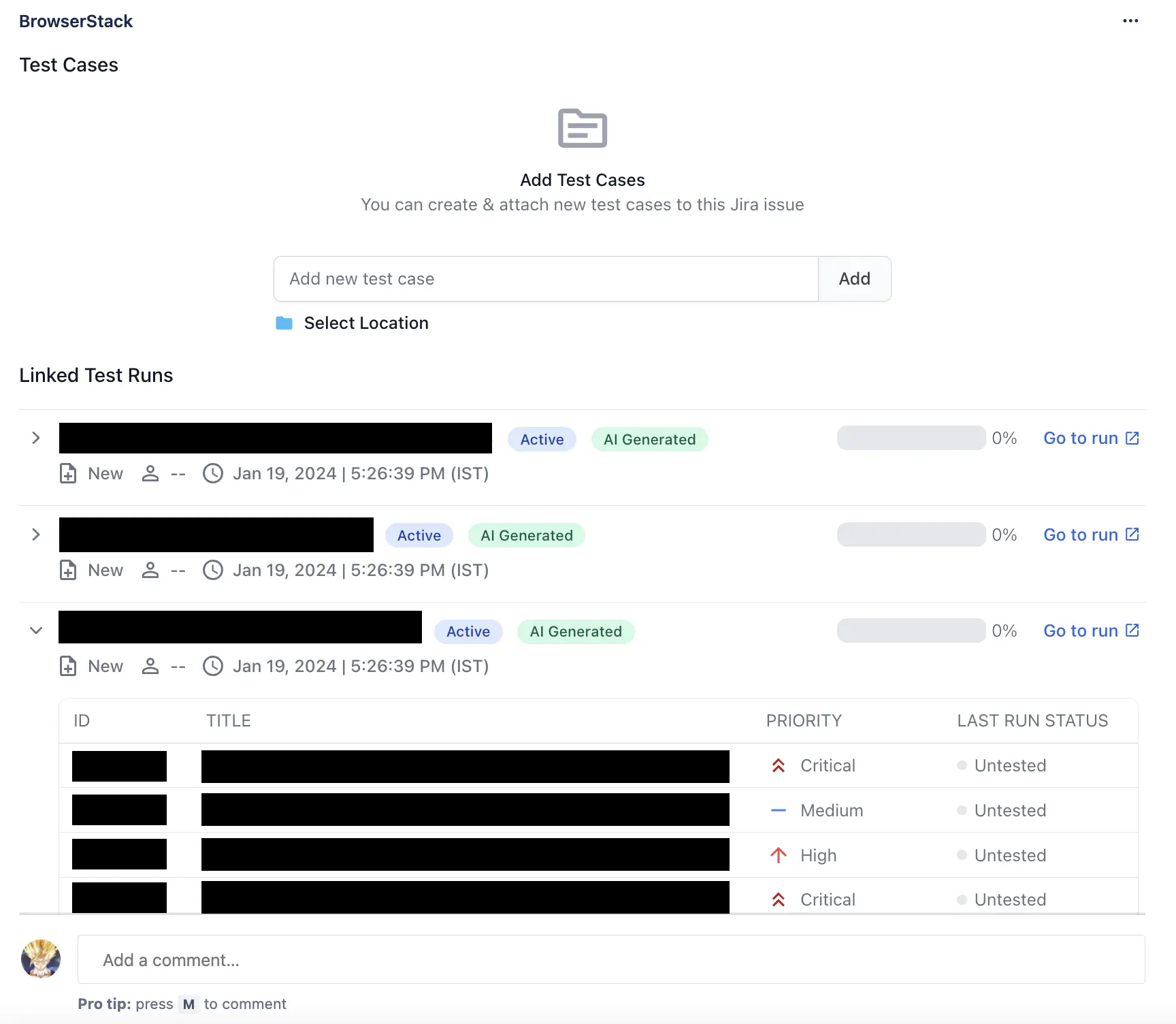 - BrowserStack AI will select test cases that relate to the Jira story and create and link Test Runs.