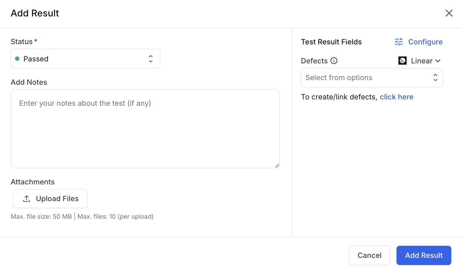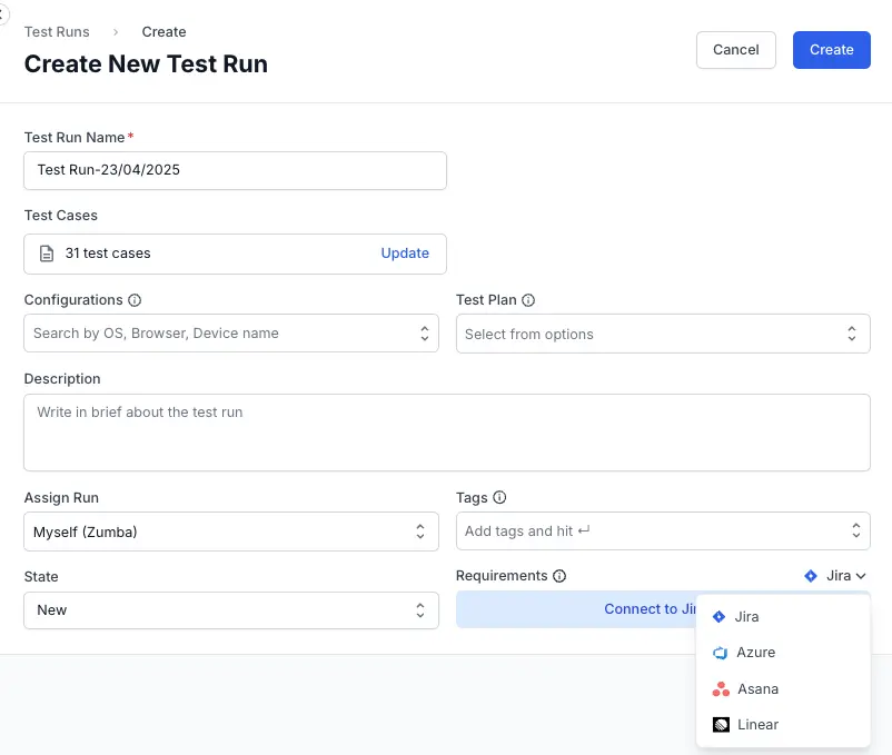 You can add Linear tasks while creating a new test run or editing an existing one. This allows you to directly associate relevant Linear tasks within the test run form.