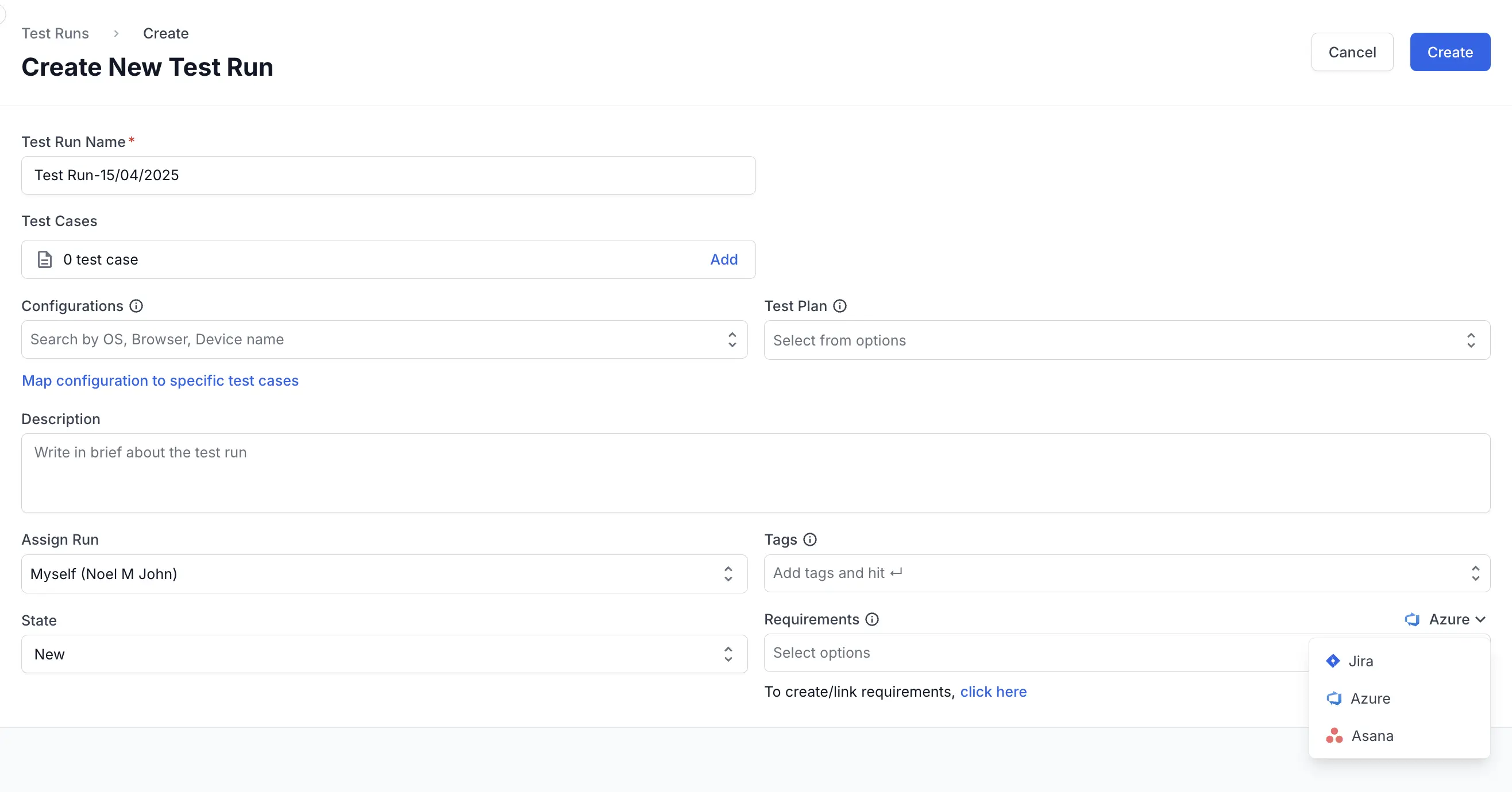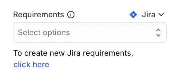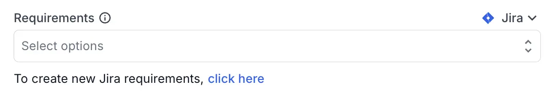 You can link a Jira requirement issue while creating the Test Run. Select or enter a Jira Issue, you can select or enter multiple Jira Issues in the Jira Issues field.