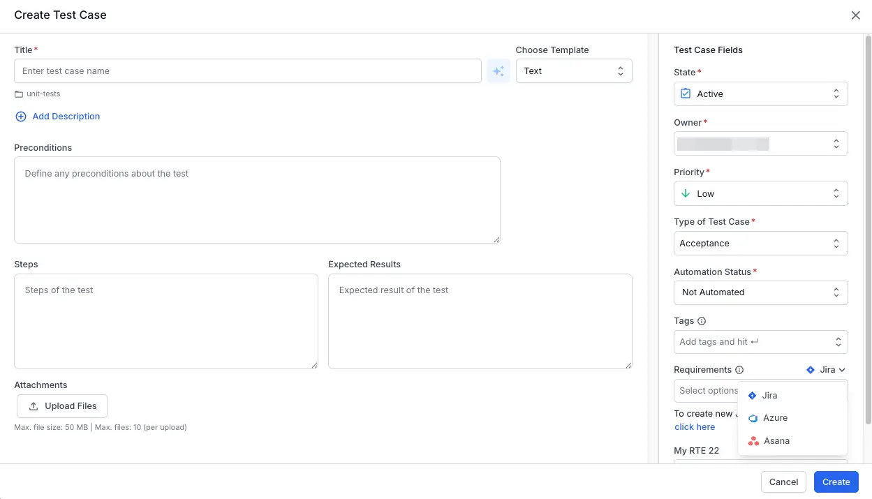 You can connect Jira requirement issues to a test case while creating a test case in the Create Test Case form.