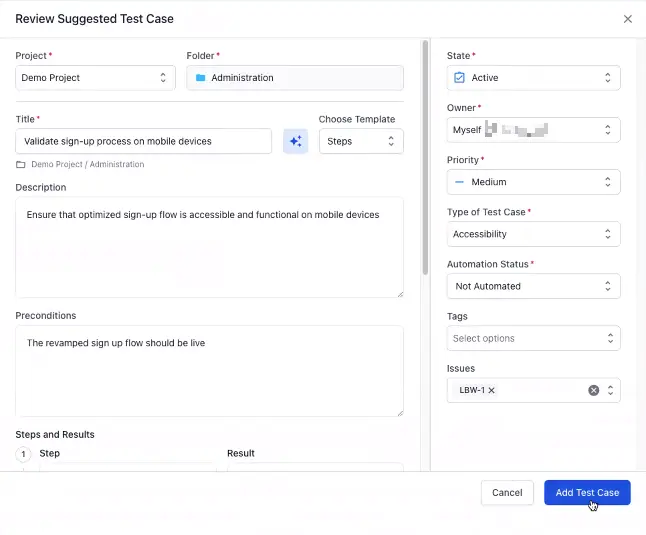 You may enter all the necessary fields, such as description, pre-conditions, steps, expected results, and so on. Optionally, you can click Remove to discard a suggested test case.
