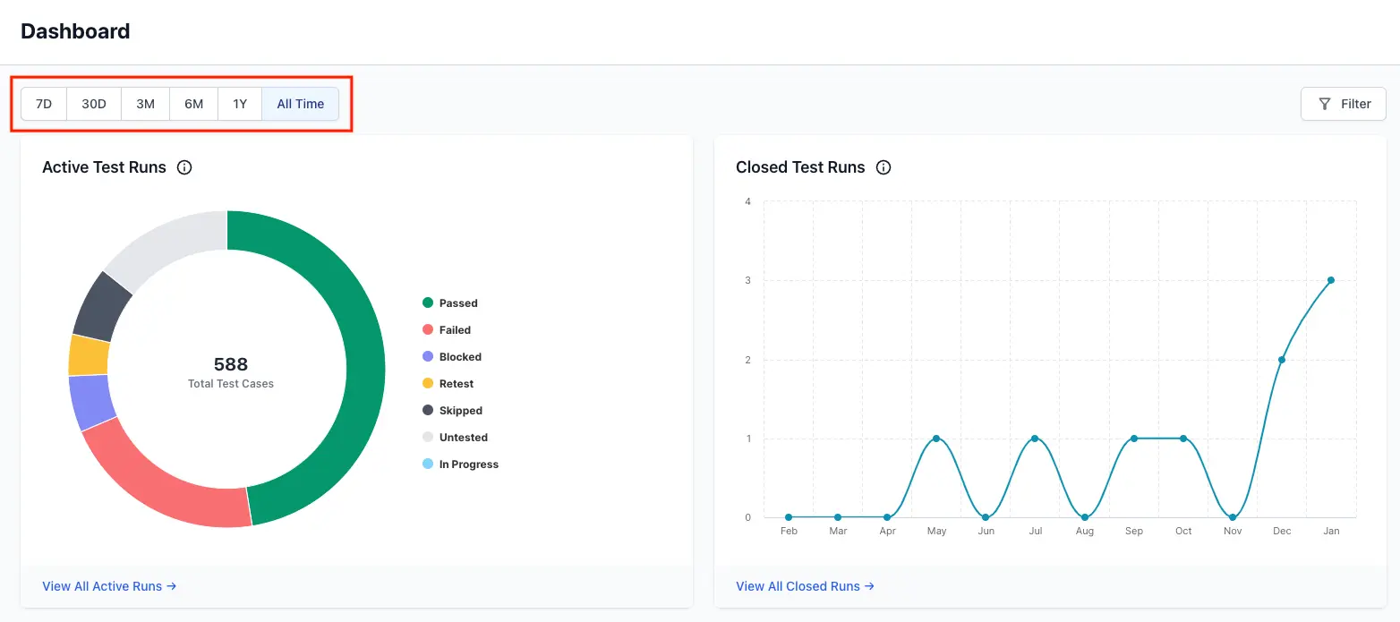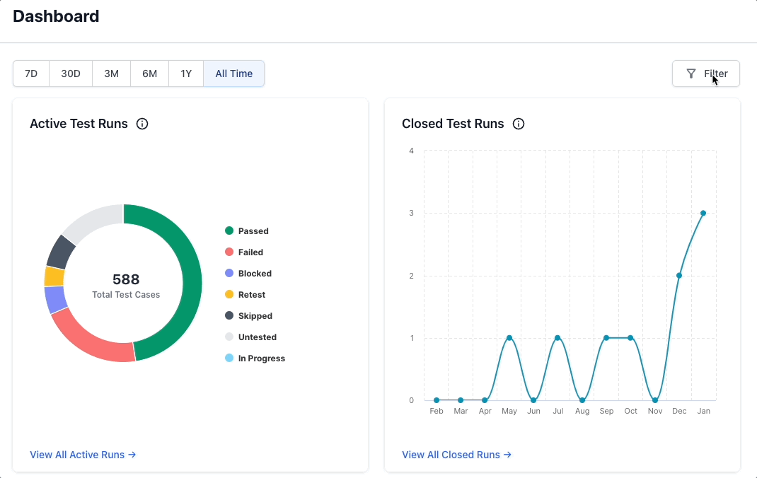 The dashboard comprises of widgets related to test runs, test cases, and linked Jira issues, each presenting specific data visualizations. You can apply these filters on every widget on the dashboard as follows:
