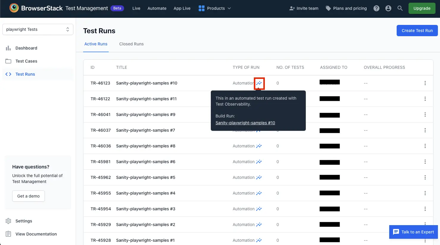 Go to Test Reporting & Analytics from Test Run reports in Test Management