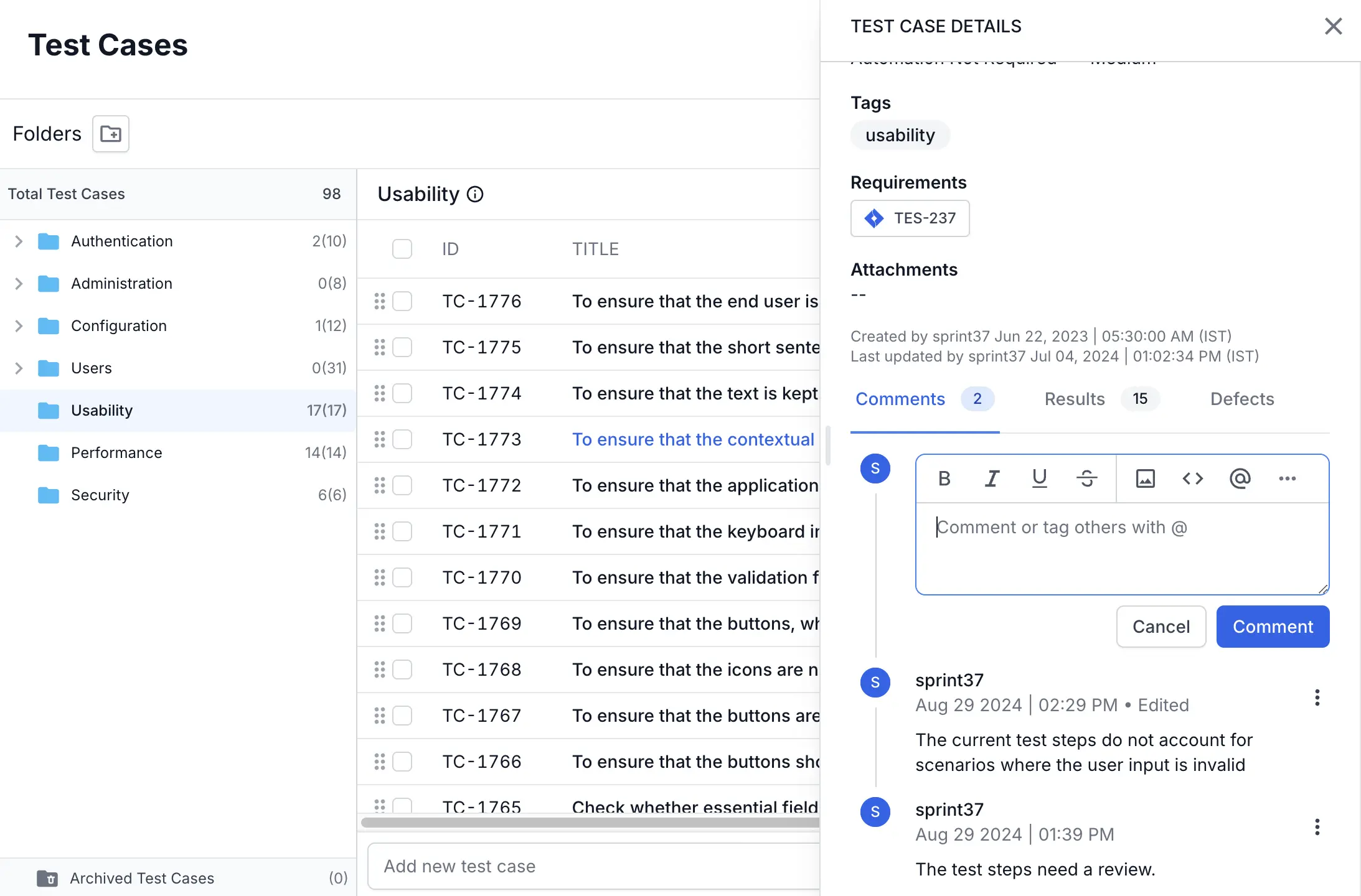 Effective collaboration is crucial during the review process when multiple team members are involved in working on the same test cases. The commenting feature in the Test Case Details view is designed to facilitate communication and ensure that every team member stays informed and engaged.