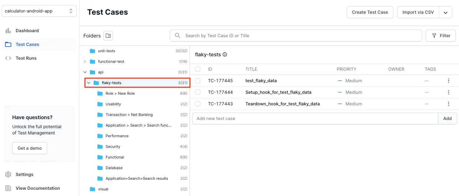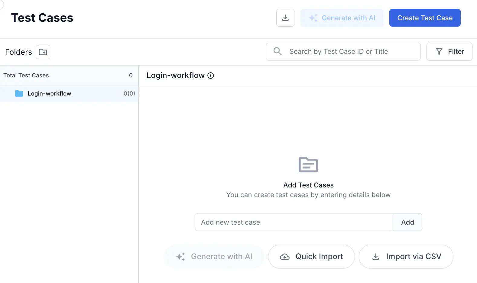 The Search functionality that allows you to look up test cases based on their Projects ID or Title within your test cases list view. The search experience is designed to be intuitive, returning relevant results quickly so that users can locate the appropriate test cases entry without having to scroll or filter through large amounts of test cases.