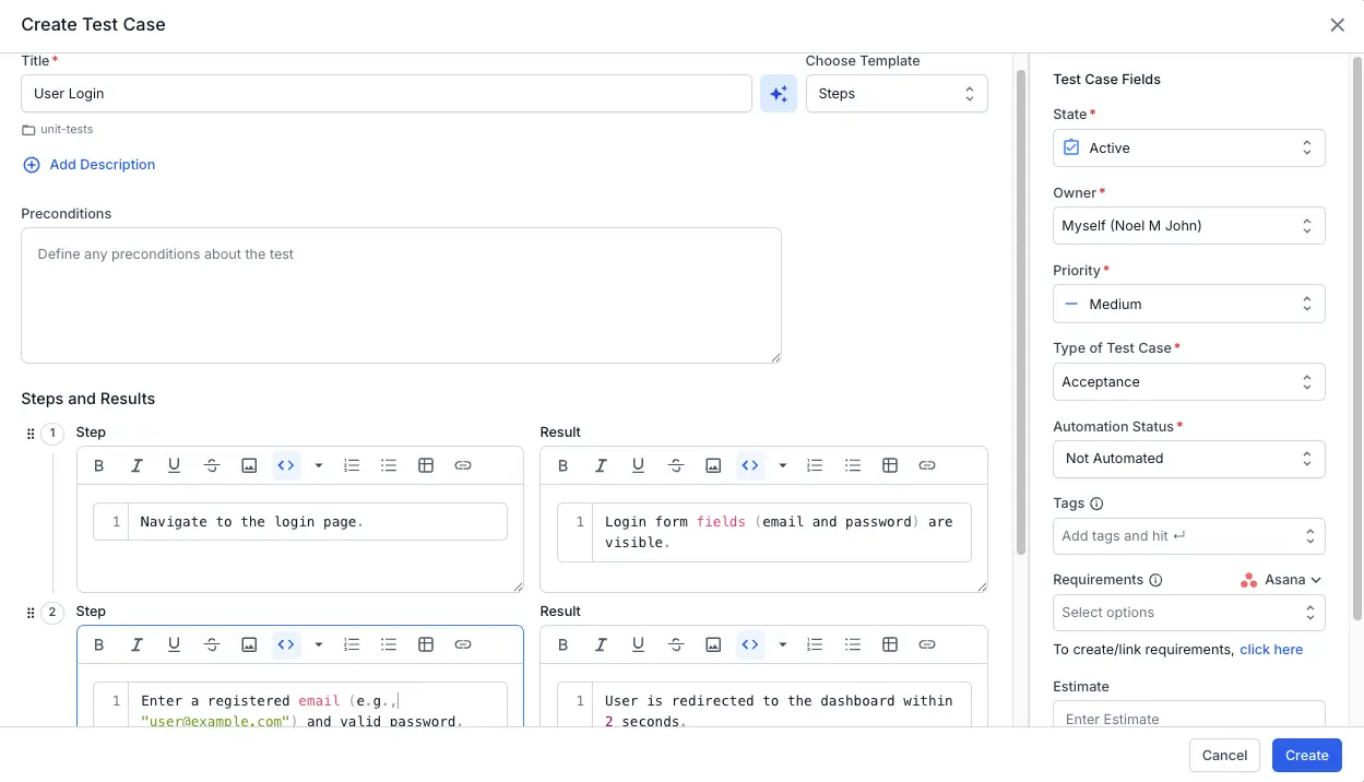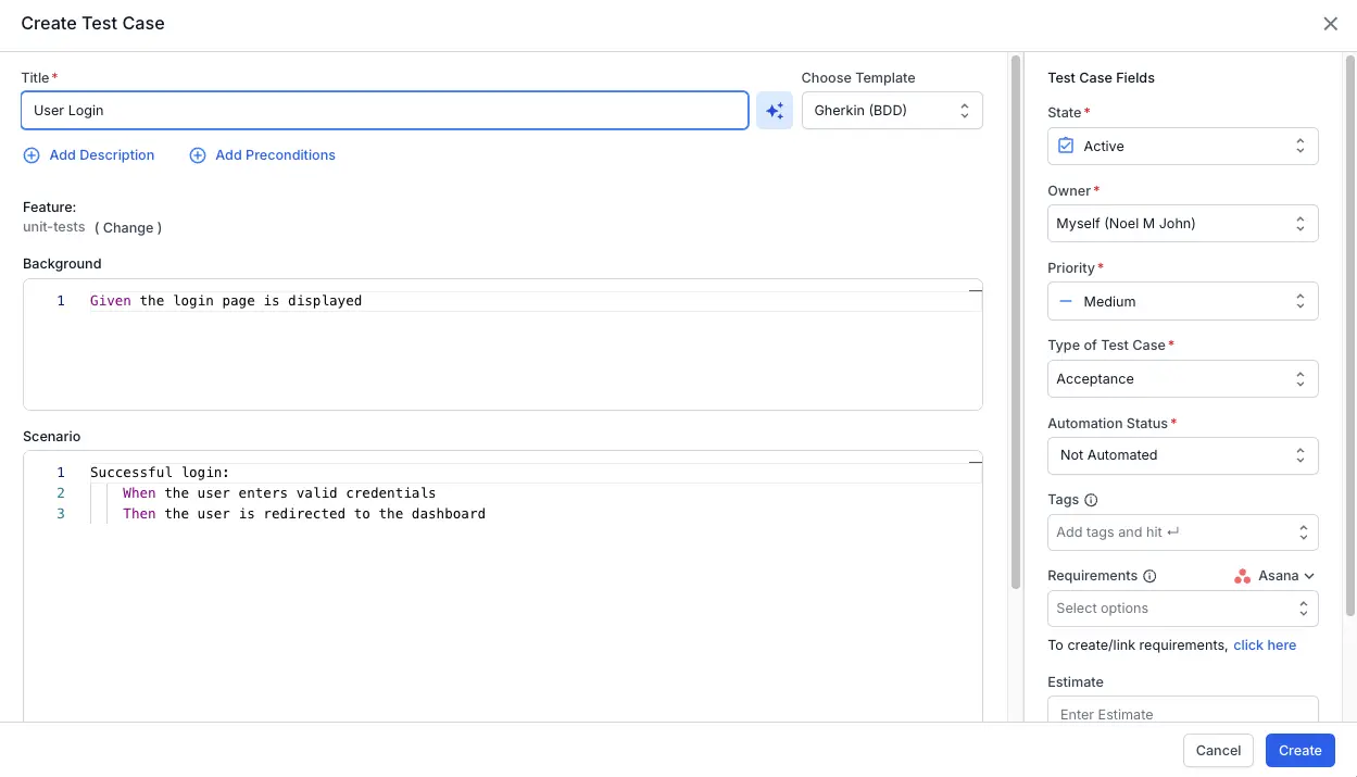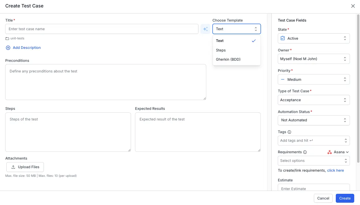Test Management supports creating test cases using Text, Steps, or BDD (Gherkin) templates based on your workflow and testing methodology.