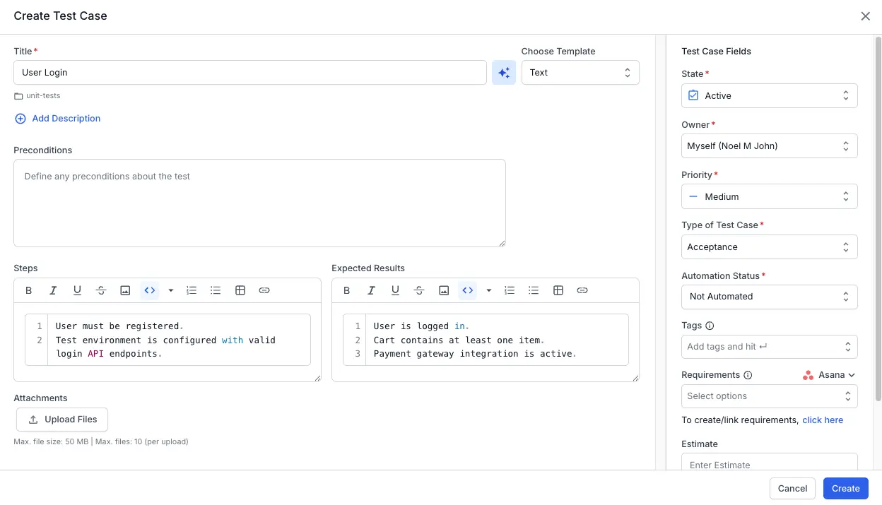 This template is ideal for simple and unstructured test scenarios. Provide straightforward descriptions, preconditions, steps, and expected results clearly in plain text. Optionally, you can add attachments upto 10 files with each file size upto 50 MB.
