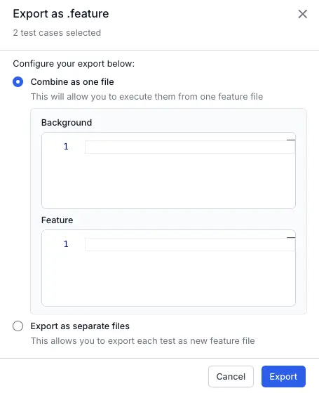 - Export as .feature: This is the recommended method for exporting BDD test cases with scenarios, ensuring readability and seamless integration with automation frameworks.