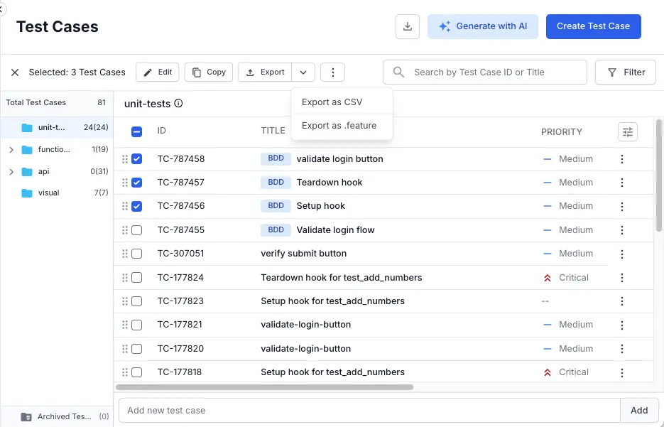 Test management allows you to export test cases to enhance collaboration, external review, and analytical capabilities. Exporting captures comprehensive test details, including test steps, preconditions, expected results, and metadata. You can export test cases as either CSV files or .feature files (specifically for BDD/Gherkin scenarios). You have the flexibility to export specific test cases tailored to your requirements.