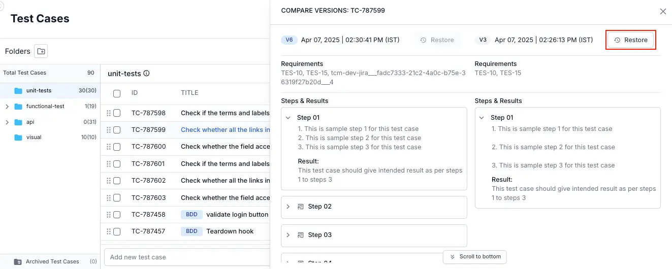 - Restoring a test case: An entry is added stating that the test case was restored.