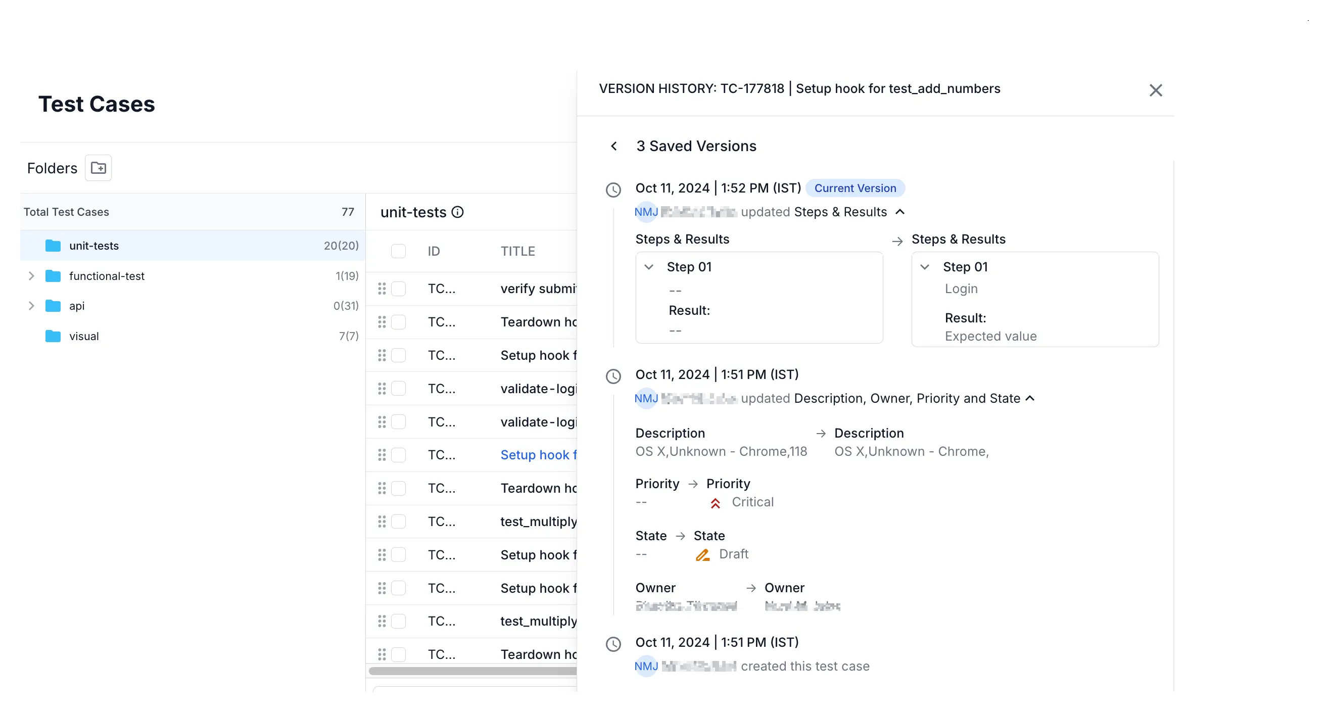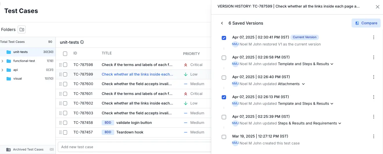 When a test case’s automation status changes (for example, from “Manual” to “Automated”), the change is recorded in the version history.