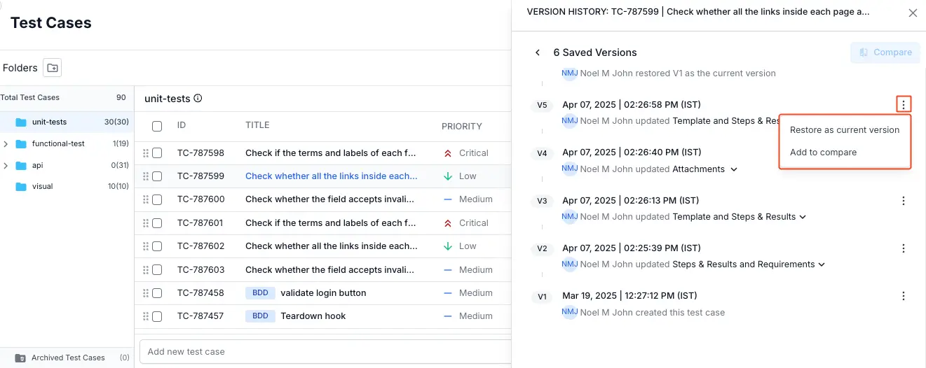- In the Test Case details view panel on the right, click versions (clock icon with the version count).