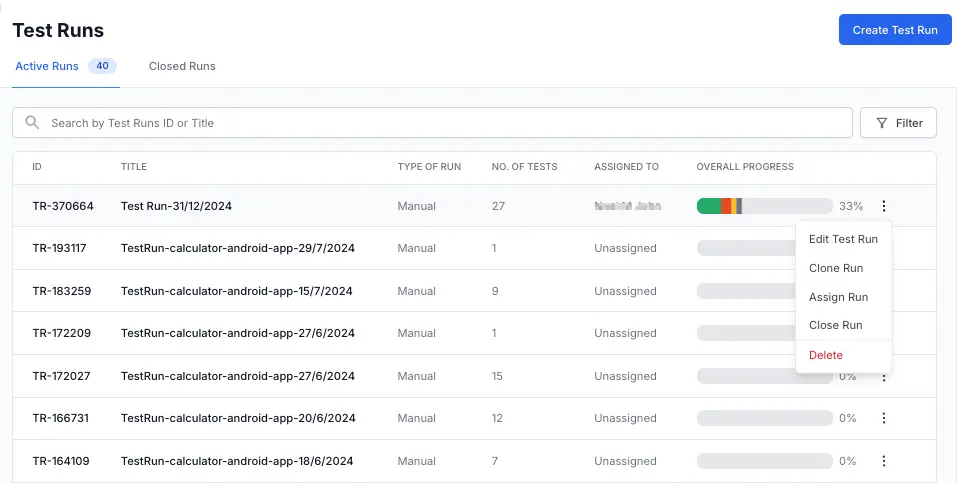 The test run is created and linked to the test plan. Newly created test run will automatically appear in the Test Runs dashboard.