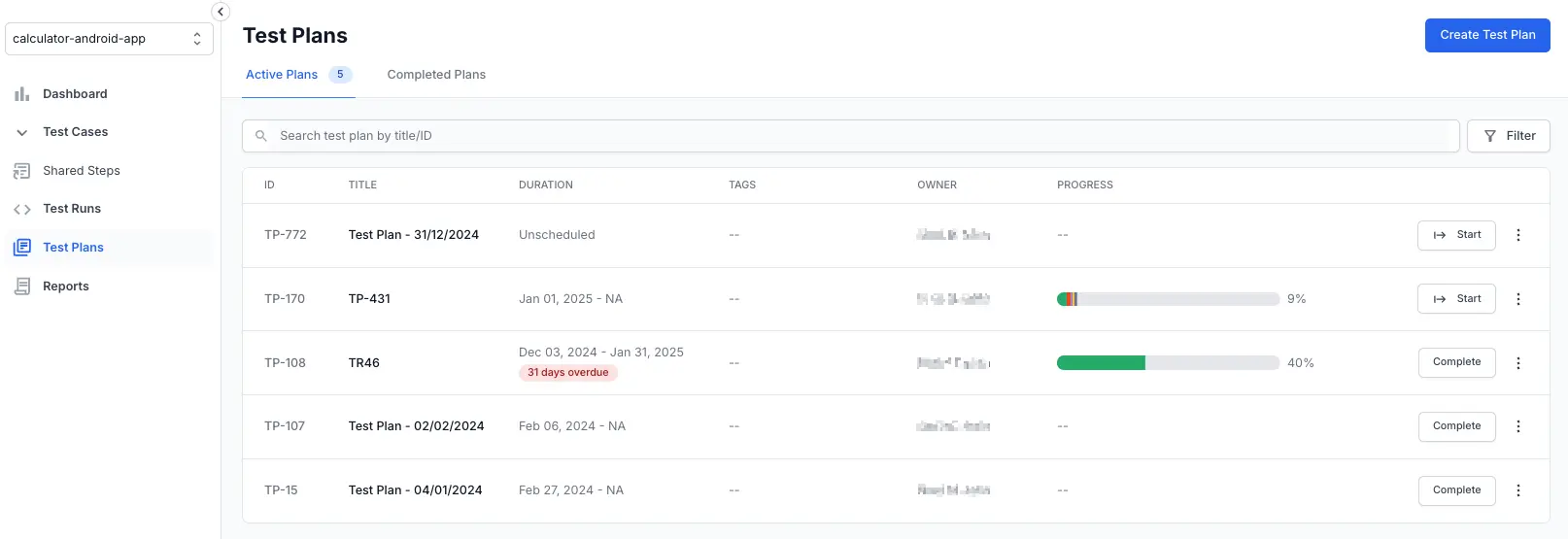 A new test plan with an ID with no linked test runs is generated. All active test plans are listed under the active plans tab in the test plans dashboard. You can now add test runs to the test plan.
