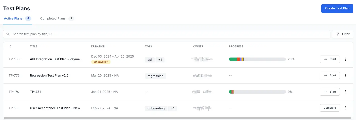 The Test Plans dashboard serves as the central hub for managing and monitoring all test plans within a project. It provides a comprehensive and clear overview of active and completed plans.