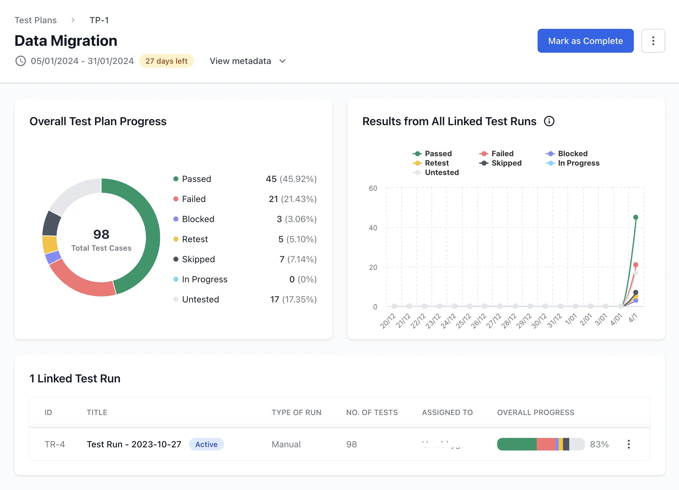 You can track the progress of all test plans, including their respective test runs and cases. -