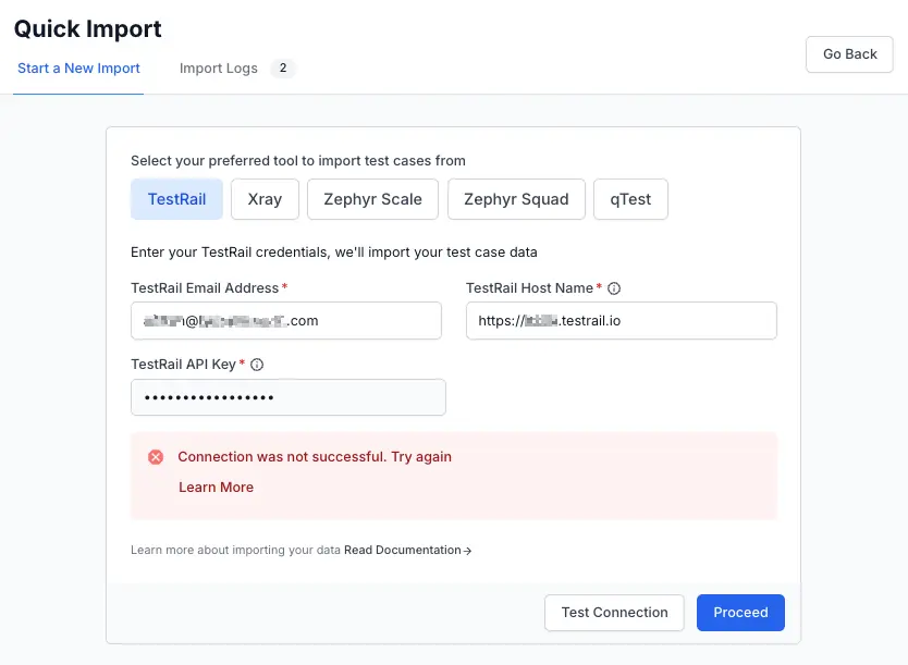 When performing a quick import from a supported tool, you might encounter issues related to connection, data conflicts, or permissions. This guide helps you identify and resolve the most common import failures, so you can get your data into Test Management successfully.