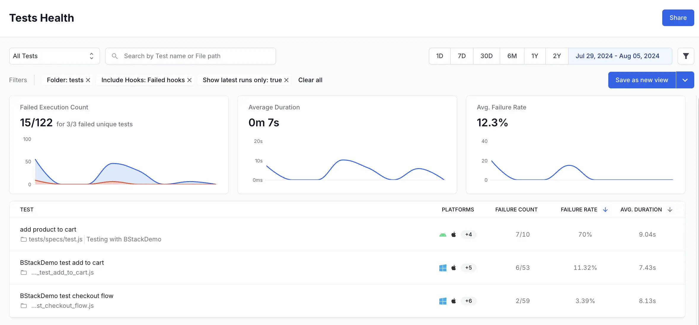 You need to organize your tests into logical folders to get maximum benefit from this widget. While configuring the widget, you can add a filter to include the data you want. You can filter data by several parameters like projects, unique build names, users, tags, etc.