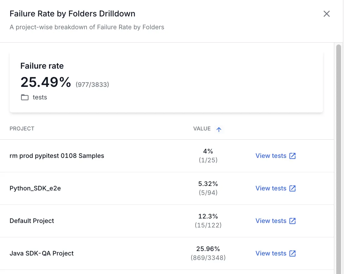 You can use the drill-down feature in the Failure Rate by Folders widget to analyze more details on the reasons for test failures. For example, if you see a folder with a large number of test failures, you can investigate the reasons.