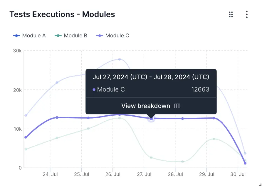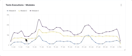 Here, the three line charts represent Module A (purple line), Module B (blue line), and Module C (yellow line) in a test suite. Such a graph can quickly tell you that Module A has a relatively high number of test executions over time, Module B tends to have the least number of test executions, and Module C has a moderate number. If the modules are relatively similar in size and complexity, using the insights from this widget, you can focus on Module B and find out the reasons for the low number of test executions using the drill-down feature. In many cases, you will be able to apply best practices followed by top-performing teams to improve the scale of test automation activity by other teams.