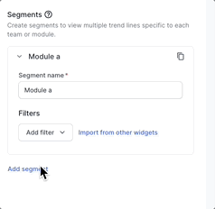 Segments: Add up to five segments in the Test Executions widget using the Add segment option. These segments appear as separate line charts in the widget. Segments should be used along with filters. You can use various filters in each segment to compare different projects, builds, users, etc.