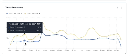 In the sample above, there are two segments: Test Executions A (yellow line) and Test Executions B (blue line). Test Executions A has more number of tests than Test Executions B at any point in time. Also, the variance in the number of tests is higher in Test Executions A than in Test Executions B.