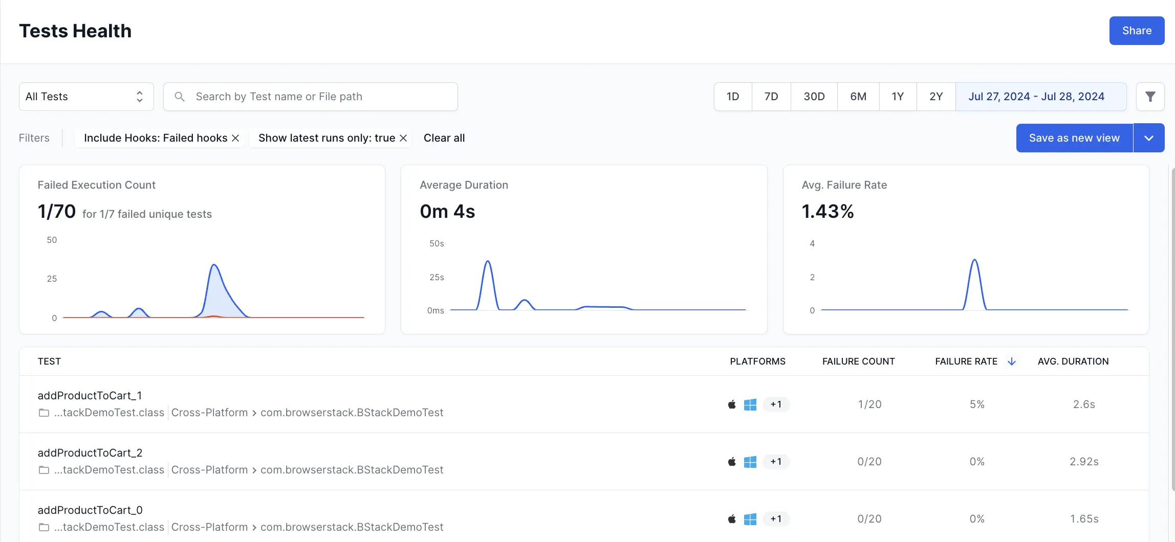 Filter: You can add a filter to include only the data you want in a particular segment. The parameters by which you can filter data are Projects, Unique Build Names, Users, Build Tags, Test Tags, Hooks Visibility, Host Names, Folder names, Device, OS, and Browser.