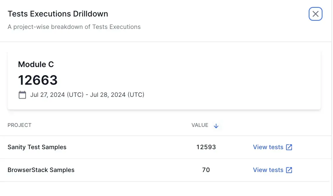 - Hover on any point in the Test Executions widget and click View breakdown. A project-wise breakdown of the test execution metrics for the selected date range opens up in a side pane.