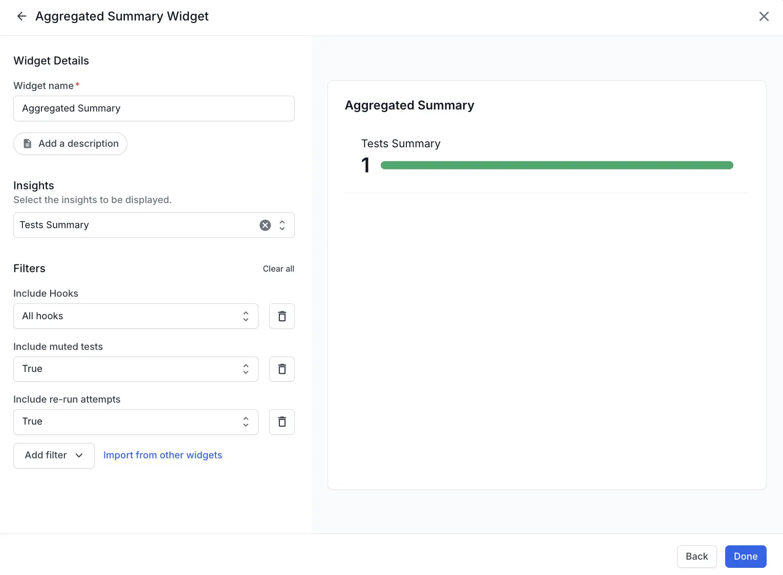 Add the following configurations in the Aggregated Summary widget in the usage dashboard to get an overview of the total number of test executions consumed by your organization: