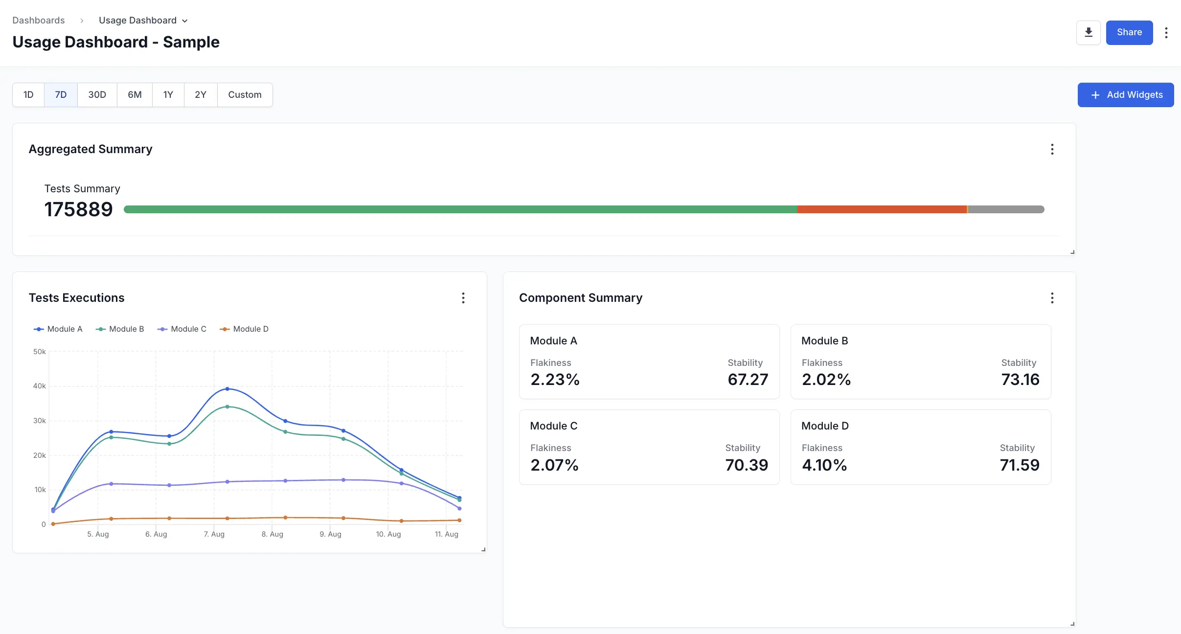 If you want to compare the aggregated numbers of test executions used by different modules, teams, users, etc, you can configure the Component Summary widget.