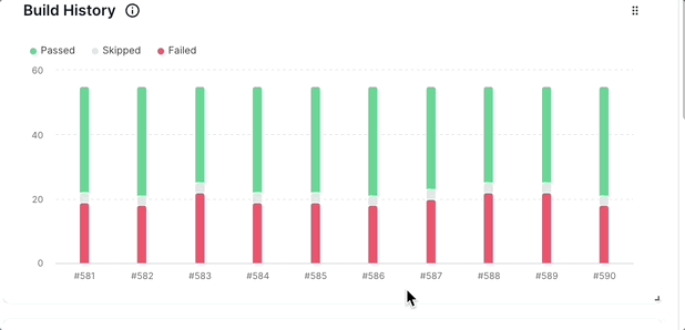 The Build History chart provides a trend of how the selected build has been performing over time. It illustrates the number of tests that were passed, failed, or skipped in each of the build runs.
