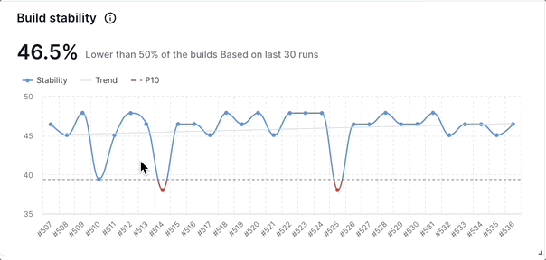 The Build stability widget illustrates the change in the percentage of tests in a specific build that passes over time. You can hover over the chart to get more information or click on any point in the chart to view the tests in detail.