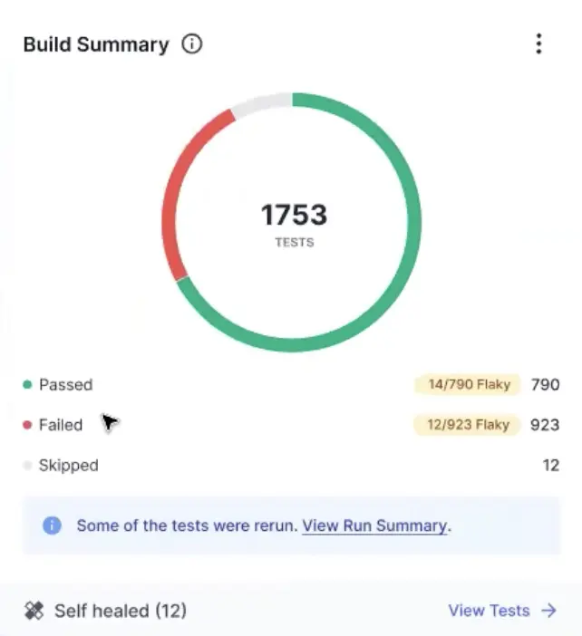 The Run Summary widget shows a summary of all the runs clubbed in a specific build. It is a comprehensive widget which consolidates information from multiple runs and re-runs of tests in a build that includes: