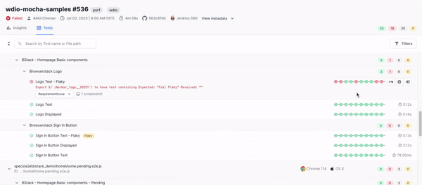 You can hover over a test to view buttons to re-run a test, report a Jira bug, and mute/unmute a test.