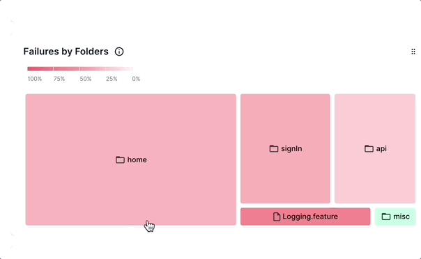 The Failures by Folders heatmap represents the failure rate of different modules in a test suite. You can hover your mouse over a folder to view the test statistics of that particular module. You can further click a folder to open subfolders and inspect a filtered view of those tests.