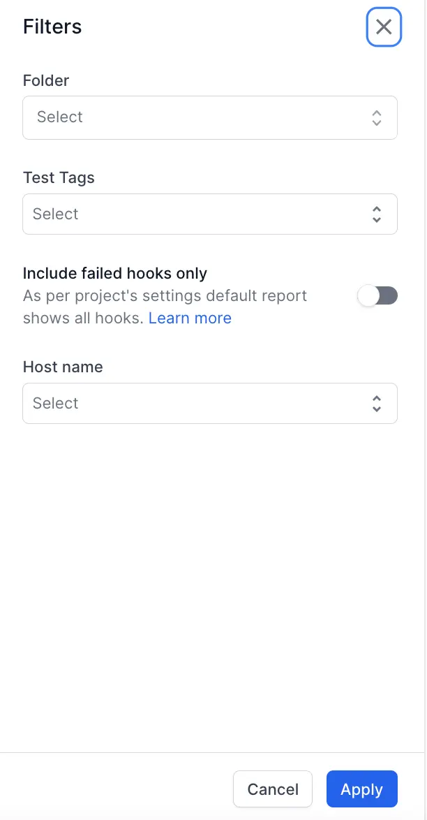 - Include Hooks: Allows you to view tests that have specific hooks associated with them.