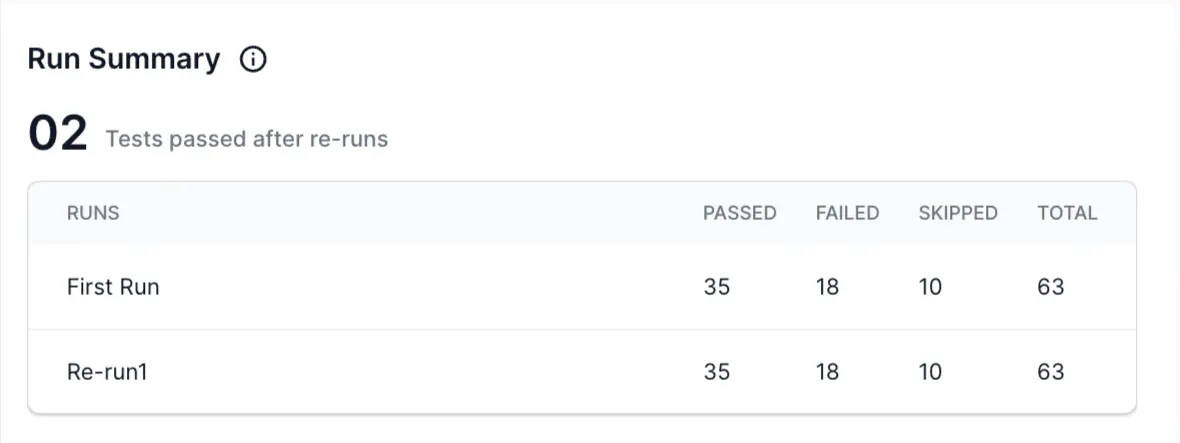 - Test Attempts: This tab caters to QAs who prefer to know how tests fared in each rerun, without complicating the information with what type of rerun it was. It lists rerun information agnostic of whether the rerun was framework-level, CI-triggered, or part of a split run. You can view the number of tests in each status, for every rerun in this tab.