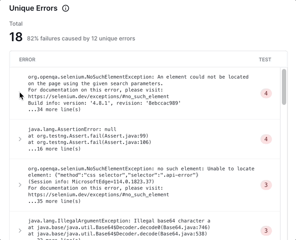 This widget allows you to take a unique yet incredibly effective approach to resolving failures in your build. By fixing one underlying error, you could fix tens of tests impacted by the same error.