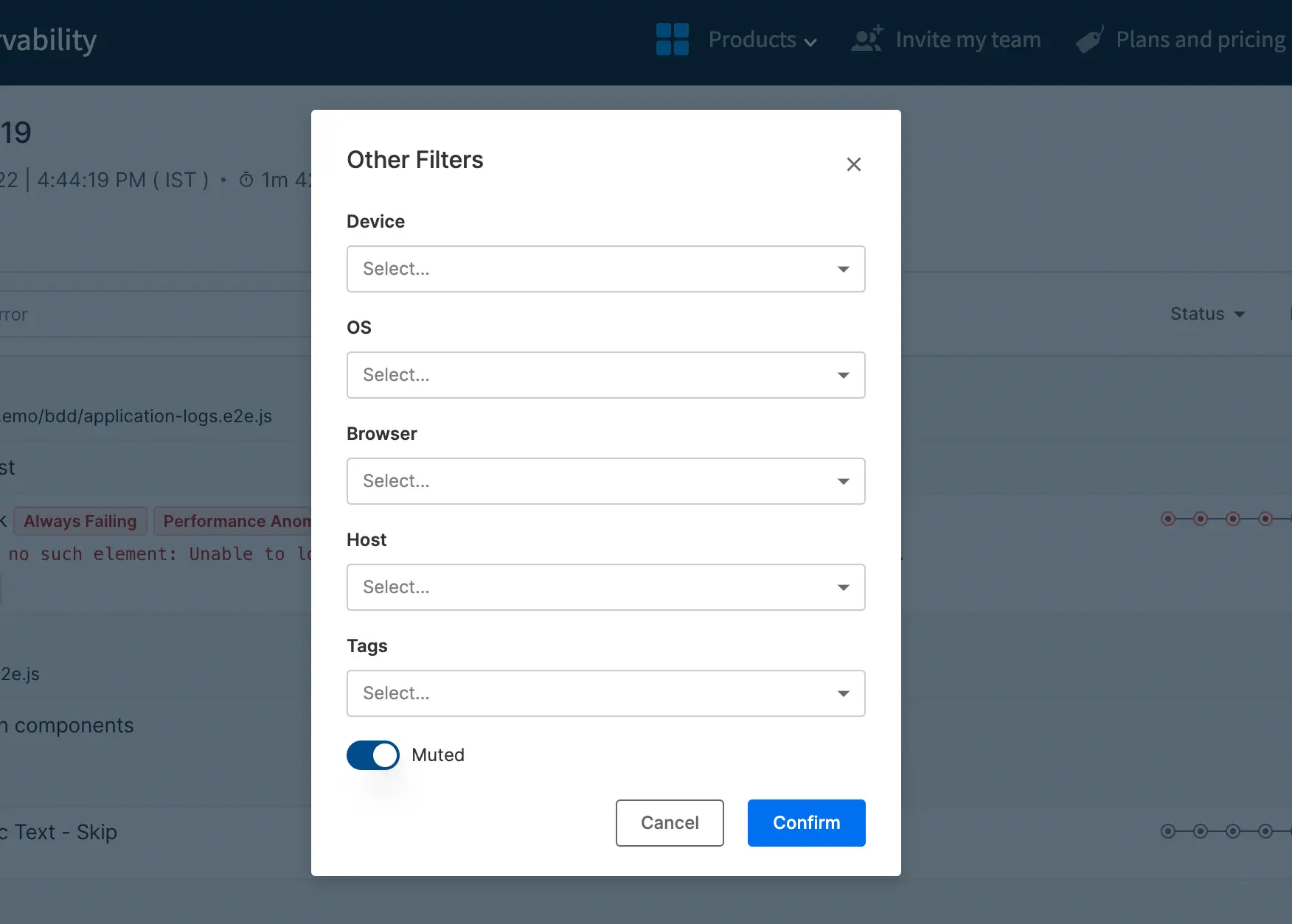 4. You can similarly “unmute” a test case but for that, you’ll first have to apply the “Muted” filter from the all filters dropdown and only then you’d see all muted tests from where you can un-mute any test case you want.