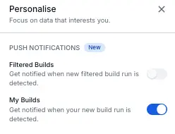 - Switch the notification on for Filtered Builds (all builds as per the filters chosen) or My Builds (only your builds as per the filters chosen) if you want to receive a notification everytime a new build run is detected. Switch this off if you don’t want to recieve notification.