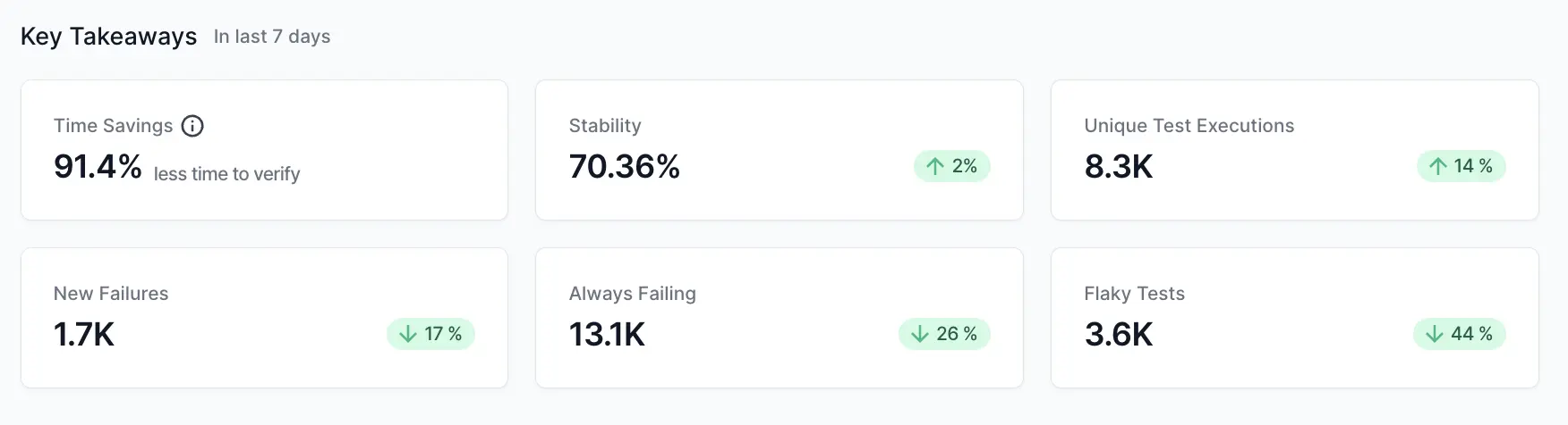 - Flaky Tests: Number of flaky tests in the last 7-day window, along with percentage deviation from the previous cycle.