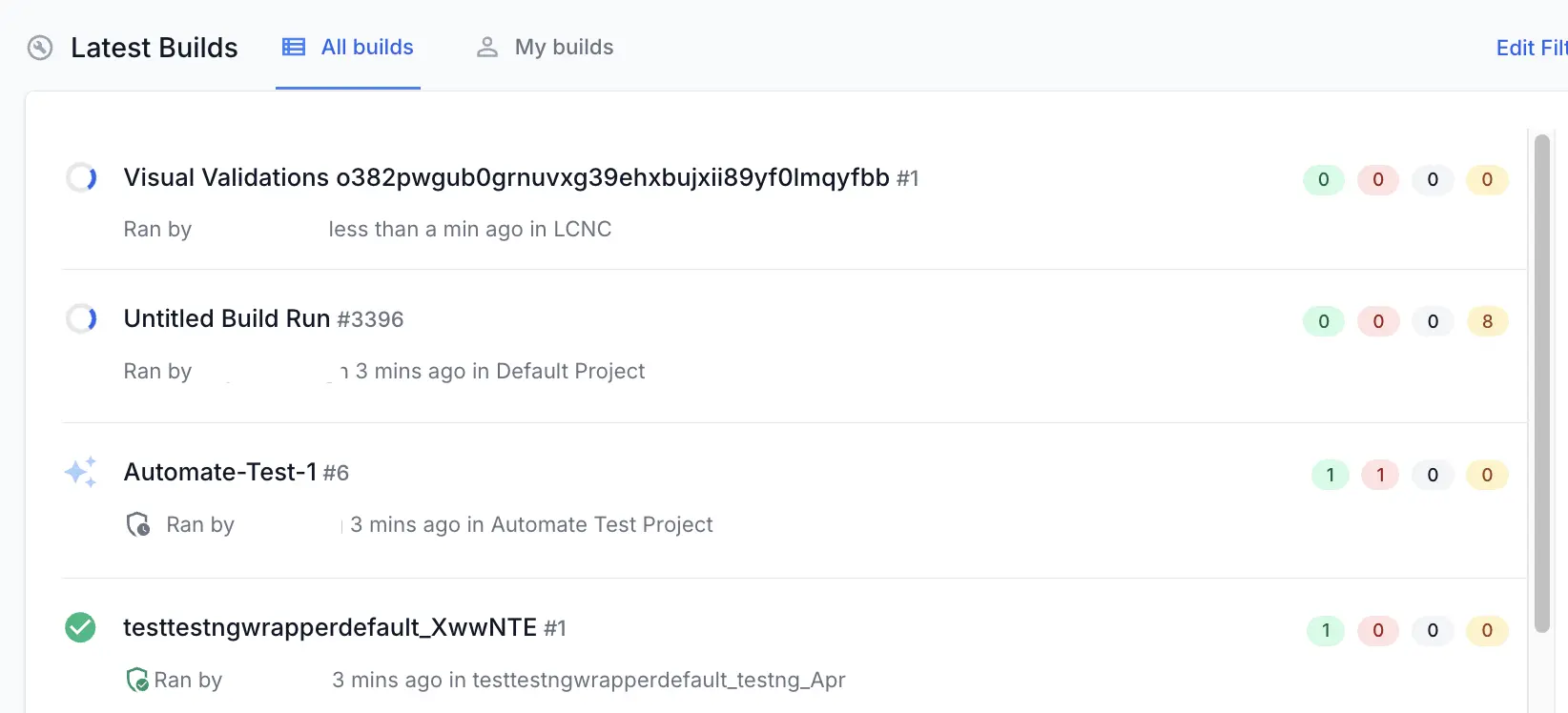 There are two tabs in Latest Builds. The All builds tab lists all the builds and My builds tab lists only the builds run by the user logged in. After you personalise your homepage, the All builds tab changes to Filtered Builds.