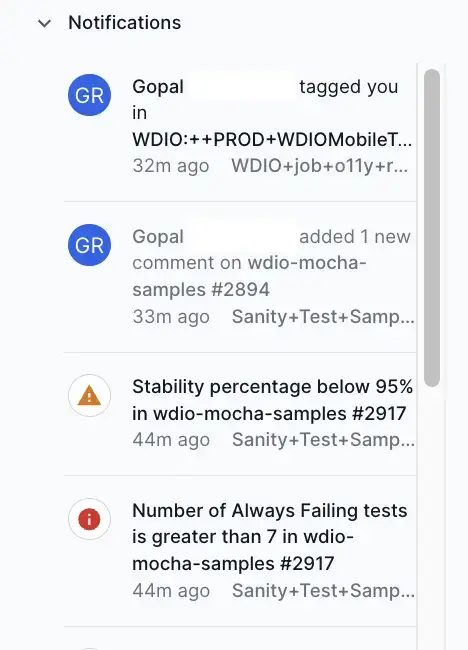 The Notifications section displays the list of alerts triggered for your builds and any comment notification based on options included while you personalise your Overview page. This includes: