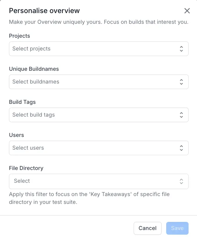 You can personalise your Test Reporting & Analytics Overview page to optimize your experience and get the best out of it. Each user can personalise the Overview page to only see data from the projects and builds relevant to them. This can be achieved by choosing projects, builds, build tags, file directories, and users who triggered the builds relevant to you. Whenever there is any change in the tests you are interested in, you can edit your personalisation to suit the new requirements.