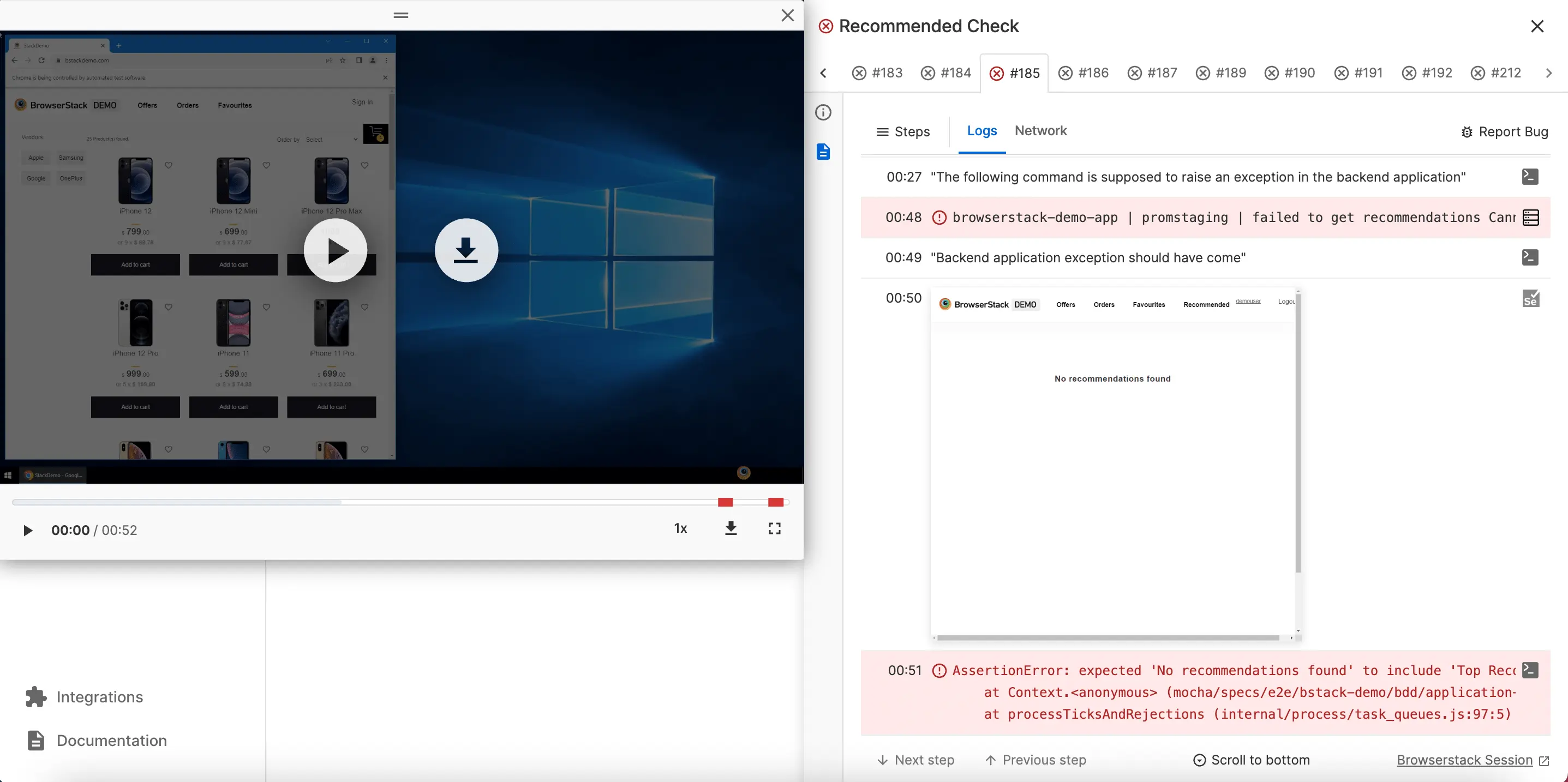 The example screenshot below shows the consolidated logs of a failed test case where the assertion error is visible along with the preceding error stack trace generated at the backend staging application server: